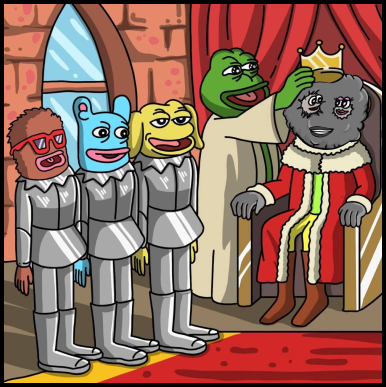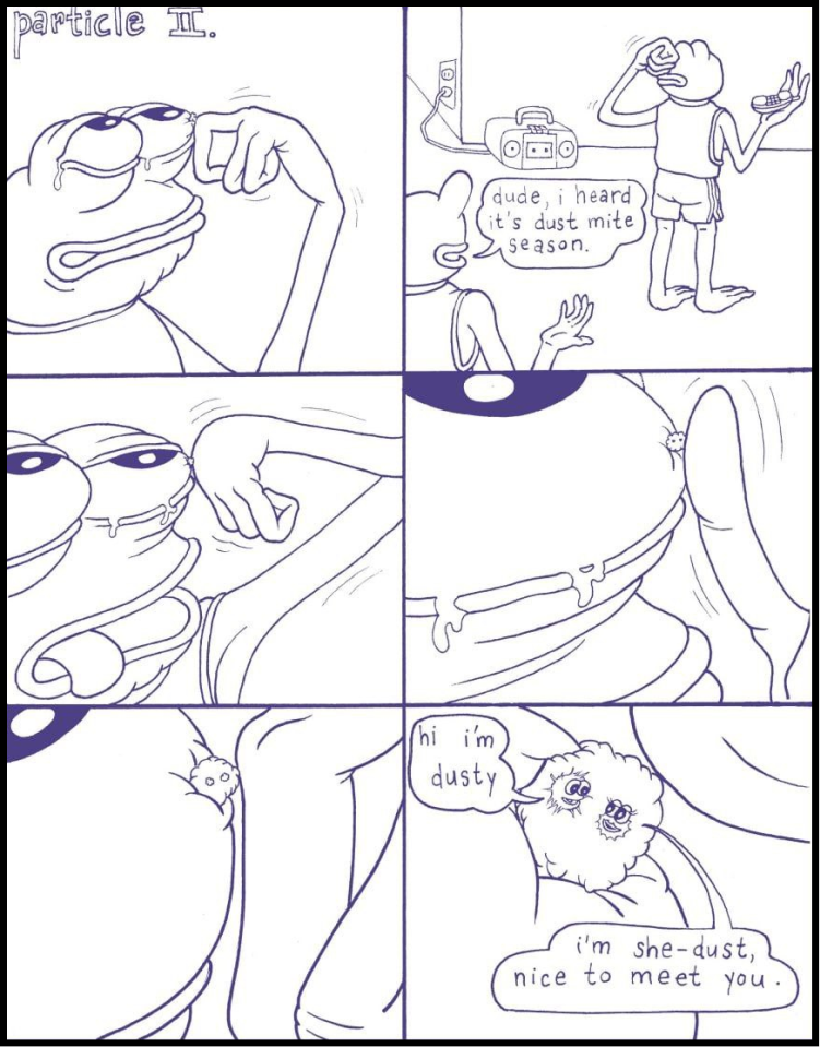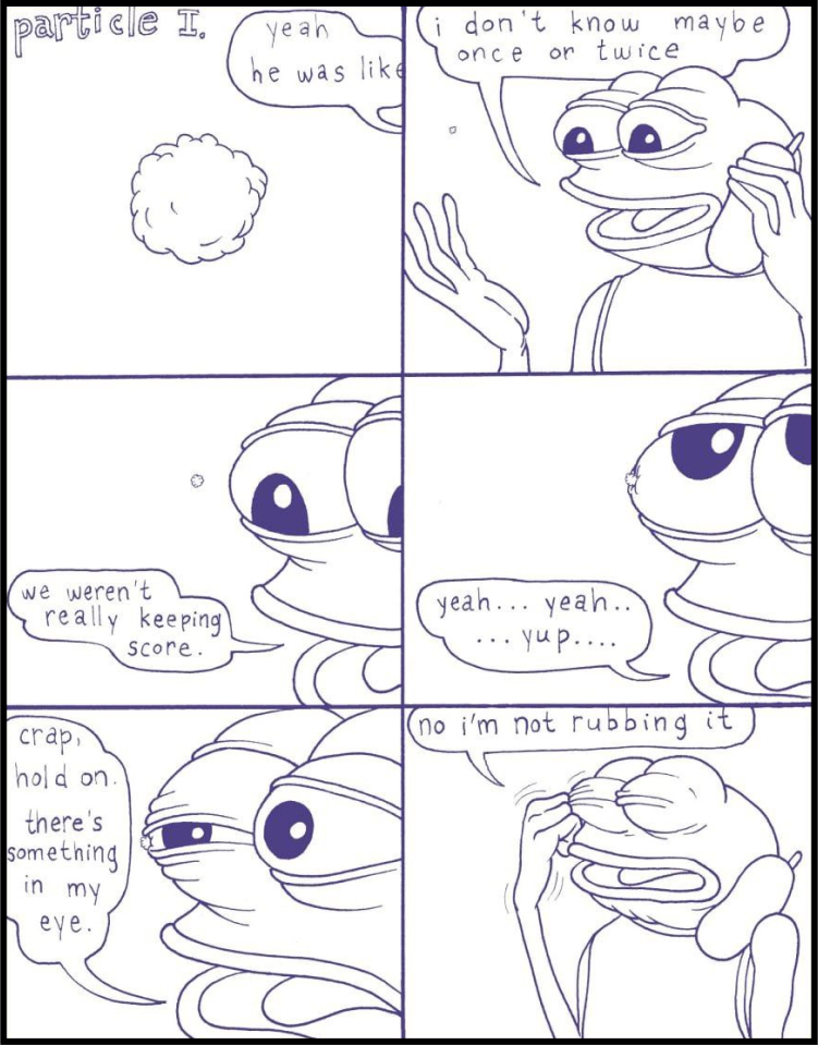 Dusty, a character in Matt Furie’s book “The Boys Club,” first appears on page 24. In his presentation to the public, Dusty reveals himself as a particle residing within Pepe’s eye.